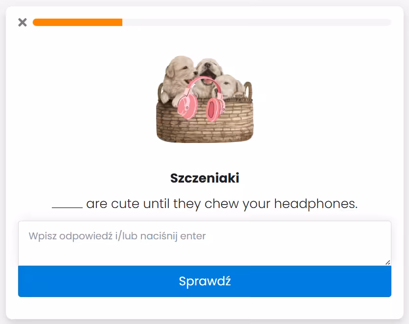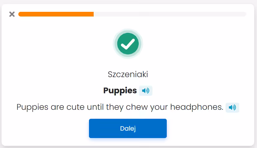 Każda fiszka zawiera krótkie, zabawne zdanie z codziennego życia nastolatków oraz tłumaczenie. Kurs uczy gramatyki w naturalnym kontekście, bez wkuwania i nudy!