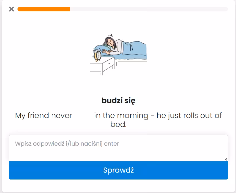 Każda fiszka to krótkie zdanie z luką i czasownikiem w nawiasie - uczeń samodzielnie uzupełnia formę, utrwalając konstrukcje twierdzące, przeczące i pytające.
